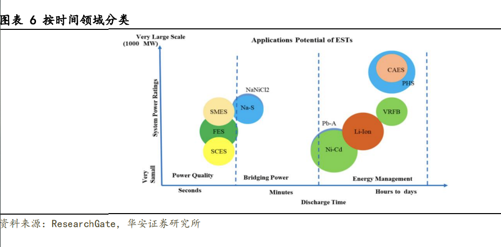 根據(jù)儲能時長,可以分為短期、中期和長期儲能。根據(jù)能量釋放持續(xù)時間,可以將 儲能方式進行區(qū)域分類。中等持續(xù)時間的類別分鐘到小時之間,功率范圍在 10-100MW。 長時間類別跨度為數(shù)小時到數(shù)天,功率范圍在 300MW 以上。目前大多數(shù)部署的電池儲存 設施的儲存時間為 4 小時或更短,如鉛酸電池、部分鋰電池、電磁儲能,可用于調(diào)峰調(diào) 頻、平滑出力、緊急備用等;大多數(shù)現(xiàn)有的抽水蓄能設施的持續(xù)時間為 8 - 12 小時或更 長,屬于長期儲能,可用于電網(wǎng)調(diào)峰調(diào)頻、備用容量等。每一種應用對儲能技術(shù)都有其 特定的要求。一些應用需要高功率和長存儲時間,而另一些應用則相反。因此,在采用 儲能之前,了解其技術(shù)特點及其應用要求是非常重要的。