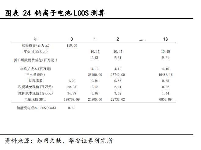 鈉離子電池儲能全壽命儲能度電成本(LCOS)測算核心假設(shè): 初始投資成本:當(dāng)前鋰離子產(chǎn)業(yè)化正在推進中,假設(shè)成熟時期可比鐵鋰電池低 20- 30%。目前成本約 370 元/kWh, 而且隨著產(chǎn)業(yè)鏈成熟,材料成本有望進一步下探,結(jié)合 結(jié)構(gòu)件好電氣件成本,初始容量投資有望控制在 500-700 元/kWh。 年度運維成本:每年需要 3.7%左右,為 0.04 元/W。 壽命:可循環(huán) 2000 次以上,中科海鈉、寧德時代等表示其產(chǎn)品可達 3000 次,隨 著研發(fā)持續(xù)投入和技術(shù)迭代,電池循環(huán)壽命有望突破 8000 次以上。 循環(huán)效率:可以達到 84-90%。 貼現(xiàn)率:考慮到當(dāng)前央企能源企業(yè)的融資成本在 4-5%,取 6%作為折現(xiàn)率。