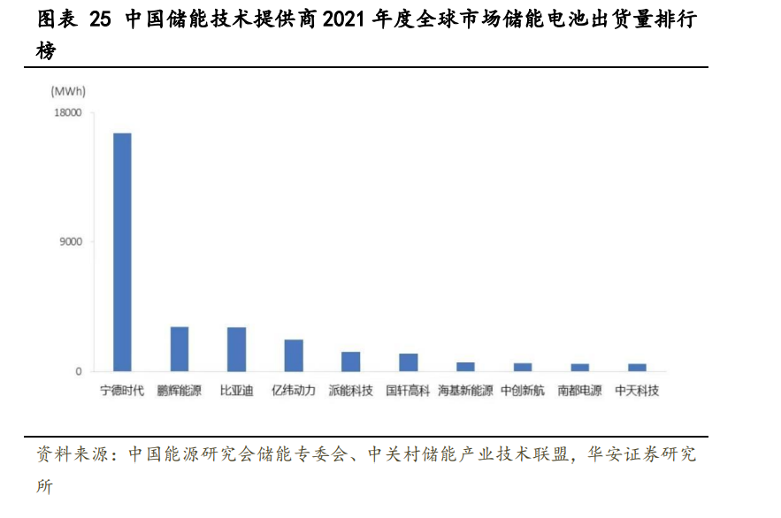 與動(dòng)力和大儲(chǔ)相比,戶用儲(chǔ)能對(duì)電芯技術(shù)的要求相對(duì)放寬。戶用場(chǎng)景對(duì)電池能量密 度等要求相對(duì)較低,影響用戶體驗(yàn)的主要是產(chǎn)品整體設(shè)計(jì),包括電池管理和全屋能源調(diào) 配等,對(duì)電芯性能的要求相對(duì)放寬,主要強(qiáng)調(diào)安全性和降本。 封裝路線尚無(wú)定型。戶用儲(chǔ)能系統(tǒng)規(guī)模在 10kWh 級(jí)別,大圓柱電池(單體容量 10Ah50Ah),方形(50Ah-300Ah),軟包(30Ah-80Ah)方案均有公司選用,目前戶儲(chǔ)采用的 電芯封裝路線并無(wú)定型。 小電芯或?qū)⒊蔀閼魞?chǔ)主流。當(dāng)前歐洲戶儲(chǔ)市場(chǎng)正經(jīng)歷低壓向高壓系統(tǒng)的產(chǎn)品迭代。 高電壓平臺(tái)可降低電流,從而控制系統(tǒng)發(fā)熱量,提高放電效率。儲(chǔ)能系統(tǒng)容量不變的情 況下,高壓系統(tǒng)對(duì)應(yīng)的電芯容量減小。例如,低壓平臺(tái)儲(chǔ)能電芯多為 100Ah,高壓平臺(tái)逐 漸向 50Ah 過(guò)渡。100Ah 以下小容量電池在戶用家儲(chǔ)領(lǐng)域仍有較長(zhǎng)的應(yīng)用生命周期。 目前我國(guó)主要儲(chǔ)能電池提供商多為動(dòng)力電池制造商。根據(jù) GGII 統(tǒng)計(jì),2021 年國(guó)內(nèi) 儲(chǔ)能電池出貨量 48GWh,其中電力儲(chǔ)能電池出貨量 29GWh,同比增長(zhǎng) 339%;而根據(jù)全球 研究機(jī)構(gòu) EVTank 與伊維經(jīng)濟(jì)研究院共 2021 年全球儲(chǔ)能電池出貨量 66.3GWh,同比增長(zhǎng) 132.6%,電力系統(tǒng)儲(chǔ)能是主要增量貢獻(xiàn)。2021 年,全球市場(chǎng)中,儲(chǔ)能電池出貨量排名前 十位的中國(guó)儲(chǔ)能技術(shù)提供商,依次為:寧德時(shí)代、鵬輝能源、比亞迪、億緯動(dòng)力、派能 科技、國(guó)軒高科、海基新能源、中創(chuàng)新航、南都電源和中天科技。