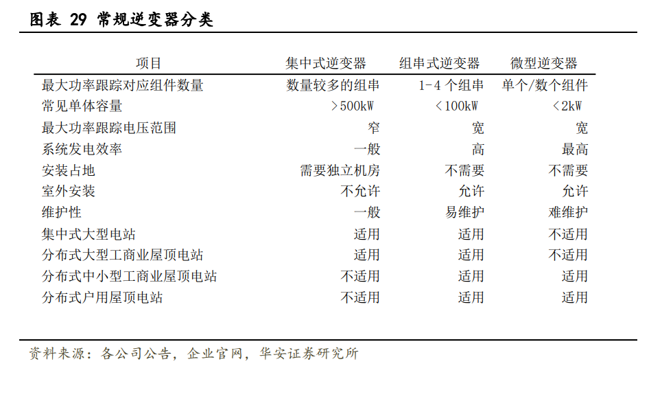 組串 PCS 彌補集中式不足,開啟規(guī)?;瘧?yīng)用。業(yè)內(nèi)目前電池儲能系統(tǒng)主要采取集中 式 PCS,多組電池并聯(lián)將引起電池簇之間的不均衡,久之并聯(lián)電池簇中會出現(xiàn)一部分電 池實際出力不足,而另一部分超出倍率使用的現(xiàn)象,造成“木桶”效應(yīng);而組串式 PCS 可 以實現(xiàn)簇級管理,提升系統(tǒng)壽命,提高全壽命周期放電容量,規(guī)?;瘧?yīng)用趨勢已見雛形。 當(dāng)前市場以組串式逆變器為主,微型逆變器尚處于發(fā)展階段。綜合考慮逆變器的不同技 術(shù)并結(jié)合其市場策略做出選擇的背景下,當(dāng)前組串式逆變器仍是市場較為主流選擇。目 前,華為、陽光電源、固德威、錦浪科技等光伏逆變器的核心供應(yīng)商均在組串式逆變器 有布局。而微型逆變器作為一種新的技術(shù)路線尚處于發(fā)展期,技術(shù)門檻較高,供應(yīng)商較 少。國外的微型逆變器市場發(fā)展較早,但出貨仍集中于海外龍頭 Enphase。我國微型逆變 器供應(yīng)商較少,一方面是因為國內(nèi)相關(guān)技術(shù)研發(fā)較晚,另一方面是因為國內(nèi)市場對于微 型逆變器的需求處于導(dǎo)入階段,尚未進(jìn)入放量階段。