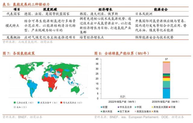 海外各國加速綠氫布局。脫碳發(fā)展逐漸成為世界各國共識,超過 130 多個國家和地區(qū)提出了碳中和目標(biāo),氫能等新興能源技術(shù)加速推進(jìn),包括日本、德國、美國、中國等在內(nèi)的 42 個國家和地區(qū)都已經(jīng)推出氫能政策,36 個國家和地區(qū)的氫能政策也正在籌備中。各國發(fā)展氫能的驅(qū)動力分為三大方面:深度脫碳、保障能源安全和實(shí)現(xiàn)經(jīng)濟(jì)增長。由于電解制氫碳排放低,純度品質(zhì)更高,隨著電解槽成本與可再生能源發(fā)電成本不斷下降,未來電解制取綠氫有望成為主流制氫手段。各國在氫能政策中均著重提出要加速布局可再生能源電解制備綠氫,2022 年全球綠氫產(chǎn)能約為 21 萬噸/年,預(yù)計到 2030 年,全球綠氫產(chǎn)能將超過 3600 萬噸/年。