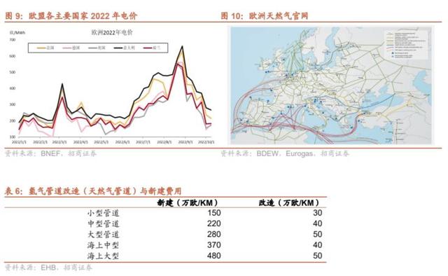 Ø 運(yùn)氫、應(yīng)用環(huán)節(jié)基礎(chǔ)設(shè)施領(lǐng)先,經(jīng)濟(jì)性更優(yōu):歐盟目前擁有成熟的天然氣發(fā)電體系,現(xiàn)有燃?xì)廨啓C(jī)經(jīng)改造可以使用純氫/摻氫發(fā)電,節(jié)約發(fā)電設(shè)備投資。同時,依托現(xiàn)有發(fā)達(dá)的天然氣運(yùn)輸管網(wǎng),改造成具備運(yùn)氫能力的管道費(fèi)用遠(yuǎn)低于新建;