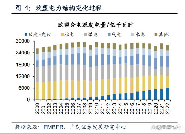 (4)棄核立場導致核電占比大降:德國退核態(tài)度堅決,法國核電發(fā)電量亦有所下降, 歐盟核電發(fā)電量相比21世紀初已大幅下滑,尤其是2022年德國繼續(xù)關停核電站以及 法國核電大面積停運檢修進一步加劇了歐盟發(fā)電量的緊張情況;