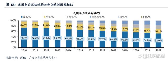 部分歐洲國家與我國電力結(jié)構(gòu)相似,能源轉(zhuǎn)型過程值得借鑒。從我國電力裝機(jī)結(jié)構(gòu)來看,過去我國以傳統(tǒng)電源火電、水電為主,2010年兩者裝機(jī)占比96%,風(fēng)光等可 再生能源逐漸成為發(fā)展重點,水電、火電裝機(jī)占比下降,2022年火電裝機(jī)占比52%, 水電開發(fā)已進(jìn)入后半程增量有限,風(fēng)光成為新增裝機(jī)主力,這與部分歐洲國家如德 國、波蘭頗為相似,2022年德國煤電發(fā)電量占比已經(jīng)降至31%,風(fēng)光發(fā)電量占比提 升至32%,其能源轉(zhuǎn)型走在我國之前。隨著我國提出雙碳目標(biāo),風(fēng)光占比提升成為 必然趨勢,德國等歐洲國家能源轉(zhuǎn)型過程中的經(jīng)驗對我國有重要的借鑒意義。