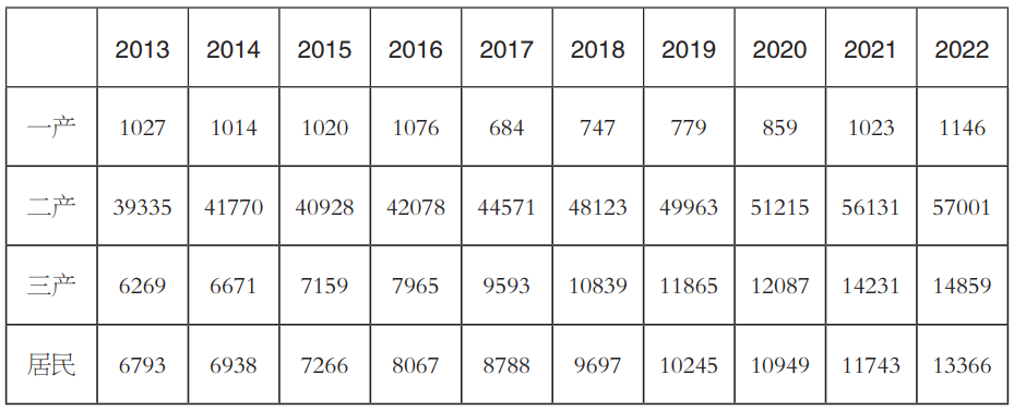 表1 2013—2022年分產(chǎn)業(yè)用電量(單位:億千瓦時(shí))