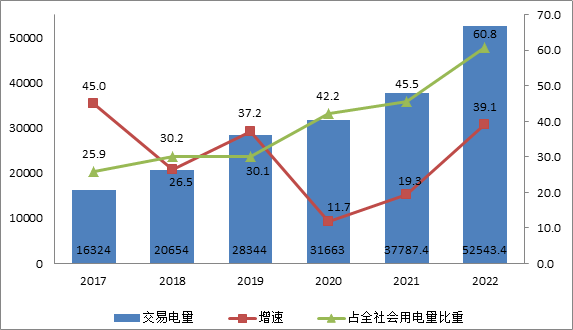 按交易結算口徑統(tǒng)計,2022年全國市場交易電量共5.25萬億千瓦時,同比增長39%,占全社會用電量比重達60.8%,同比提高15.4個百分點。其中,跨省跨區(qū)市場化交易電量首次超1萬億千瓦時,同比增長近50%。2022年國家電網(wǎng)經(jīng)營區(qū)域市場交易電量達4.16萬億千瓦時,同比增長42.7%;南方電網(wǎng)經(jīng)營區(qū)域市場交易電量0.85萬億千瓦時,同比增長27.4%;內(nèi)蒙古電網(wǎng)經(jīng)營區(qū)域市場交易電量0.24萬億千瓦時,同比增長24.9%。在電力交易機構注冊的市場主體數(shù)量首次超過60萬家,同比增長29%。