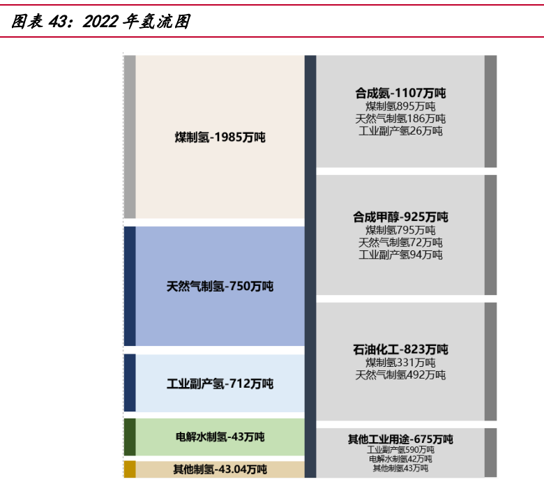 當(dāng)前國內(nèi)氫能大部分應(yīng)用于工業(yè)領(lǐng)域,包括合成氨、合成甲醇及石油化工。隨著 長期碳中和目標(biāo)的提出,氫氣的能源屬性將逐漸顯現(xiàn),應(yīng)用領(lǐng)域?qū)⒅鸩酵卣怪岭娏Α?交通、建筑等場景。以中國 2022 年氫產(chǎn)能下游應(yīng)用為例,其中合成氨氫氣需求 1107 萬噸,占 31.1%。合成氨作為化肥和其他化工產(chǎn)品的重要原材料,60%用于農(nóng)業(yè)化肥生 產(chǎn),30%用于工業(yè)生產(chǎn),而交通部門(船舶運輸)和發(fā)電部門(摻氨燃燒)占比很低。 合成甲醇氫氣需求 925 萬噸,占 26.2%。合成甲醇大部分用于化工合成,主要合成 產(chǎn)品為烯烴、甲醛、醋酸、MTBE 以及二甲醛等。石油煉化氫氣需求 823 萬噸, 占 23.3%。 未來,氫氣因其熱值高,質(zhì)量能量密度大的特點或?qū)⒈粡V泛應(yīng)用于交通領(lǐng)域,氫 燃料電池汽車比傳統(tǒng)的純電動車具備更長的續(xù)航能力。2022 年我國氫燃料電池車累 計銷量 12682 輛,加氫站累計建成 274 座,依據(jù)中國國家發(fā)展和改革委員會發(fā)布《氫 能產(chǎn)業(yè)發(fā)展長期規(guī)劃(2021-2035)》提出,到 2025 年燃料電池車輛保有量約為 5 萬 輛。同時,因氫氣單位質(zhì)量的熱值遠大于天然氣,能夠更好地滿足建筑供熱需求而應(yīng) 用于建筑發(fā)電等其他領(lǐng)域。