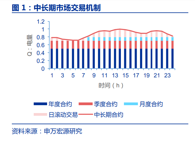 如果把上述五個方向繼續(xù)向下展開,涉及到的品種多達十幾種,紛繁復雜的電力交易 品種以及各不相同的機制提高了對電力市場研究的門檻。但從電力系統(tǒng)運行的本質來說, 不論是電能量市場、輔助服務市場還是容量電價,大體上都是要實現(xiàn)兩個功能:有功平衡 和無功平衡。 有功平衡即電力系統(tǒng)需要保持發(fā)電功率和用電負荷時時刻刻相等。為了保證供電的可 靠性以及用電成本的穩(wěn)定性,用戶側需要提前安排和預測其未來的用電需求,發(fā)電側需要提前預測其未來出力情況(風電、光伏、水電等)或安排發(fā)電計劃(化石能源),因此需 要提前簽訂用電合約來使供需平衡。但不論新能源的出力還是用電計劃,距離用電時間越 遠把握性越小,所以根據(jù)簽訂合約時點與實際用電時點的遠近,可以分為中長期和現(xiàn)貨交 易,本質目的是對電力合約進行分解,使得電力合約與實際用電需求盡量匹配。 中長期交易從時間尺度上可以分為年度合約、季度合約、月度合約等,現(xiàn)貨交易則主 要分為日前、日內(nèi)和實時現(xiàn)貨交易。將電能量市場根據(jù)時間尺度不同分解為不同的產(chǎn)品, 本質上是在市場靈活性和交易成本之間取平衡,時間尺度越長靈活性越差,交易成本越低, 反之則靈活性越強但交易成本越高。