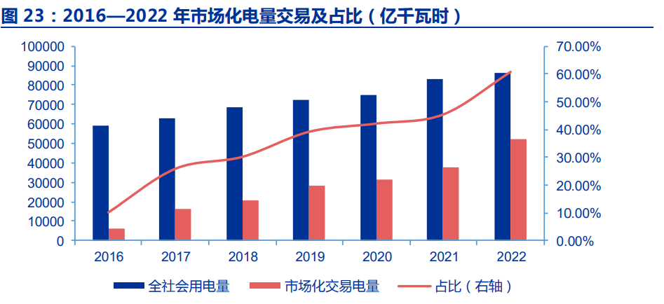 電力交易業(yè)務(wù)是電力市場(chǎng)化最直接收益的業(yè)務(wù)。由于電力市場(chǎng)的設(shè)計(jì)復(fù)雜,各地交易 規(guī)則、品種不一,同時(shí)也要求對(duì)整個(gè)電力系統(tǒng)的運(yùn)行規(guī)律有深刻理解,是高度專業(yè)化的業(yè) 務(wù),電力交易決策本身對(duì)于電力市場(chǎng)參與者的收益造成較大影響。 市場(chǎng)化售電規(guī)模有快速擴(kuò)張潛力。根據(jù)中電聯(lián)相關(guān)數(shù)據(jù),2022 年我國(guó)市場(chǎng)化交易電量 規(guī)模達(dá)到 5.25 萬(wàn)億千瓦時(shí),占全社會(huì)總用電量的規(guī)模已超過(guò) 60%,考慮到優(yōu)先購(gòu)用電,直 觀看起來(lái)售電規(guī)模增長(zhǎng)空間有限。但實(shí)際上:(1)我國(guó)目前市場(chǎng)化交易電量大部分仍通過(guò) 電網(wǎng)代理購(gòu)電,直接購(gòu)電以及通過(guò)售電公司購(gòu)電比例較低;(2)我國(guó)電力現(xiàn)貨市場(chǎng)才開始 推廣,雖然各地要求中長(zhǎng)期電量占比要達(dá)到 70%—90%以上,但由于絕大多數(shù)省份現(xiàn)貨市 場(chǎng)均采用全電量結(jié)算,因此實(shí)際的現(xiàn)貨交易量可能會(huì)接近全社會(huì)用電量。以廣東省為例, 2022 年全省本地機(jī)組發(fā)電量 5844 億千瓦時(shí),中長(zhǎng)期交易電量 2871 億千瓦時(shí),現(xiàn)貨市場(chǎng) 總交易量達(dá) 3801 億千瓦時(shí)。