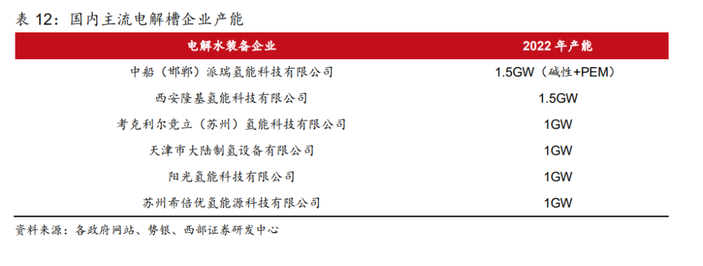 電解水制氫是指水分子在直流電作用下被解離生成氧氣和氫氣,分別從電解槽陽(yáng)極和陰極 析出。根據(jù)工作原理和電解質(zhì)的不同,電解水制氫技術(shù)通常分為四種,分別是堿性電解水 技術(shù)(ALK)、質(zhì)子交換膜電解水技術(shù)(PEM)、高溫固體氧化物電解水技術(shù)(SOEC)和 固體聚合物陰離子交換膜電解水技術(shù)(AEM)。 電解水制氫技術(shù)以堿性電解為主,PEM 電解次之。“雙碳”目標(biāo)提出后,國(guó)內(nèi)電解水制氫 項(xiàng)目規(guī)劃和推進(jìn)逐步加快,2022 年國(guó)內(nèi)堿性電解槽企業(yè)已披露產(chǎn)能接近 11GW,堿性電 解水制氫技術(shù)已完成商業(yè)化進(jìn)程,產(chǎn)業(yè)鏈發(fā)展成熟,且具備成本優(yōu)勢(shì),已實(shí)現(xiàn)大規(guī)模應(yīng)用; PEM 電解水技術(shù)則處于商業(yè)化初期,產(chǎn)業(yè)鏈國(guó)產(chǎn)化程度不足,電解槽雙極板、膜材料以及 鉑、銥等貴金屬催化劑材料成本更高且極度依賴(lài)進(jìn)口;高溫固體氧化物電解水技術(shù)和固體 聚合物陰離子交換膜電解水技術(shù)還處于研發(fā)示范階段,未實(shí)現(xiàn)商業(yè)化應(yīng)用。