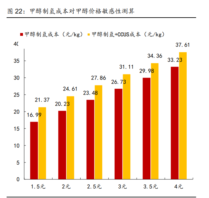 3)甲醇制氫成本測(cè)算——單位成本約 23 元/kg,考慮碳捕集 28 元/kg