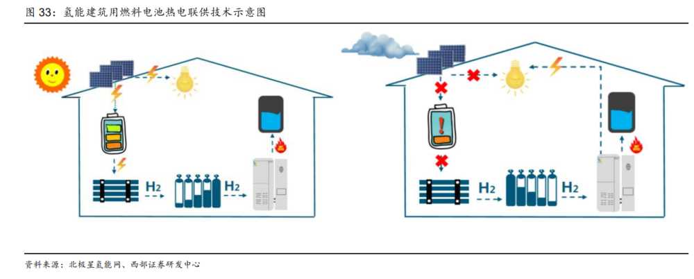 氫建筑應(yīng)用仍處于導(dǎo)入階段,未來(lái)存在較大市場(chǎng)空間。氫能建筑,是近年發(fā)展起來(lái)的一種綠色建筑新理念。它以氫能完全或部分替代市政電網(wǎng)、天然氣等傳統(tǒng)能源,滿足建筑對(duì)冷、 熱、電、生活熱水等各種能源的需求,在提高建筑用電可靠性的同時(shí),還有助于優(yōu)化國(guó)內(nèi) 的能源結(jié)構(gòu)、降低電網(wǎng)整體投資和減少問(wèn)題氣體排放。 目前全球建筑供熱和電力需求約占全球能源需求的 1/3。全球多個(gè)國(guó)家積極探索氫能在建 筑領(lǐng)域應(yīng)用,利用氫氣通過(guò)發(fā)電、直接燃燒、熱電聯(lián)產(chǎn)(CHP)等形式為居民住宅或商業(yè) 區(qū)提供電熱水冷多聯(lián)供。如氫可與天然氣混合(氫氣摻混比例為 0~20%),通過(guò)基于燃?xì)?輪機(jī)或燃料電池的 CHP 技術(shù),利用現(xiàn)有建筑和能源網(wǎng)絡(luò)基礎(chǔ)設(shè)施提供靈活性和連續(xù)性的 熱能、電力供應(yīng),從而取代化石燃料 CHP。此外,100% 的純氫可通過(guò)氫鍋爐用于建筑 供熱,但氫氣價(jià)格需低至 1.5~3.0 美元/kg 時(shí),才能與天然氣鍋爐和電動(dòng)熱泵競(jìng)爭(zhēng)。而對(duì) 于分布式供暖,氫能是少數(shù)幾種可以與天然氣競(jìng)爭(zhēng)的低碳替代品,隨著制氫成本和氫鍋爐、 燃料電池成本的下降,以及氫氣利用現(xiàn)有天然氣管道輸送能力的提升,預(yù)計(jì)到 2030 年, CHP 中氫鍋爐與氫燃料電池的成本為 900~2000 美元/(戶·年),建筑熱電聯(lián)供的氫能 需求量為 3 萬(wàn)~ 9 萬(wàn) t/年。