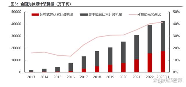 我國分布式光伏累計裝機占比逐漸提升。相比于集中式光伏,分布式光伏規(guī)模 較小、輸出電壓功率較小且更接近用戶側(cè),具有投資小、建設(shè)快、占地面積小等優(yōu) 勢。截至 2022 年底,中國光伏累計裝機量達 392GW,其中分布式光伏累計裝機 量達 158GW,占比 40%。