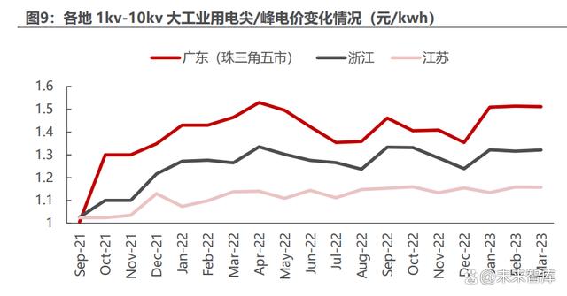 “分時電價”、“電力市場化”政策驅(qū)動,大工業(yè)平均用電價格提高。2021 年 下半年全國大部分省份陸續(xù)出臺分時電價政策,調(diào)整峰谷電價及峰谷時段,其中以 江蘇、廣東、浙江為例的經(jīng)濟發(fā)達省份率先、多次調(diào)整,峰谷價差有較大幅度的擴 大,尖、峰時段也有不同程度的延長,大工業(yè)平均用電價格提高。