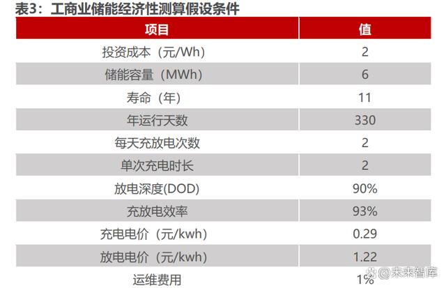 工商業(yè)儲能經(jīng)濟性測算假設(shè)條件:1)項目案例:浙江 3MW/6.88MWh 用戶 側(cè)儲能系統(tǒng)項目,假設(shè)工廠白天負荷穩(wěn)定可完全消納儲能放電,且變壓器容量滿足 儲能充電需求;2)項目成本拆分:我們假設(shè)工商業(yè)儲能項目整體投資成本為 2 元 /Wh,其中電池占比 55%,集裝箱占比 15%,BMS 占比 7%;3)運行模式:考 慮工廠休息及設(shè)備檢修,儲能設(shè)備每年運行 330 天,每天進行兩次充放電。第一 次在夜間谷價充電,在上午尖峰電價放電 2 小時;第二次在午間谷價充電 2 小時, 在下午尖峰電機放電 2 小時;4)峰谷價差:參考浙江工商業(yè)峰谷電價,假設(shè)尖峰 電價 1.22 元/KWh,低谷電價 0.29 元/KWh,峰谷價差為 0.93 元/KWh。