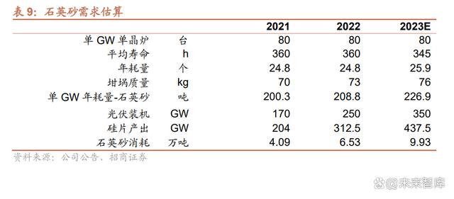 石英坩堝是硅片生產(chǎn)過程中的消材,目前尚無替代品。石英坩堝主要應用于光伏 及半導體領域的拉晶環(huán)節(jié),是硅片生產(chǎn)流程中的關鍵材料。在硅棒拉制過程中, 石英坩堝逐步向方石英轉(zhuǎn)化,一定時間后無法使用,需要更換新的石英坩堝,在 硅片環(huán)節(jié)生產(chǎn)過程中具備較強的消耗品屬性。 石英坩堝原材料為高純石英砂,目前與高純石英砂比較相似的產(chǎn)品是合成石英砂, 但因成本及微量元素含量的限制,無法使用于光伏領域。 預計 2023 年石英砂供需偏緊。需求方面,預計 2023 年全球光伏裝機 350GW, 假設每100GW硅片的石英消耗為1.8-2萬噸,則石英砂需求預計9.3-10.3萬噸; 供給方面,尤尼明+TQC 合計 2.5-3 萬噸產(chǎn)能,石英股份 4.5-5 萬噸,其他產(chǎn)能 合計約為 1 萬噸,供給預計在 8-9 萬噸。 此外,2023 年海外石英砂占總產(chǎn)能比重約為 35%左右,整體看,行業(yè)內(nèi)石英坩 堝使用壽命會下降,石英砂需求會進一步提升,2023 年石英供需緊張相對明確, 漲價時間及幅度可能會超預期。