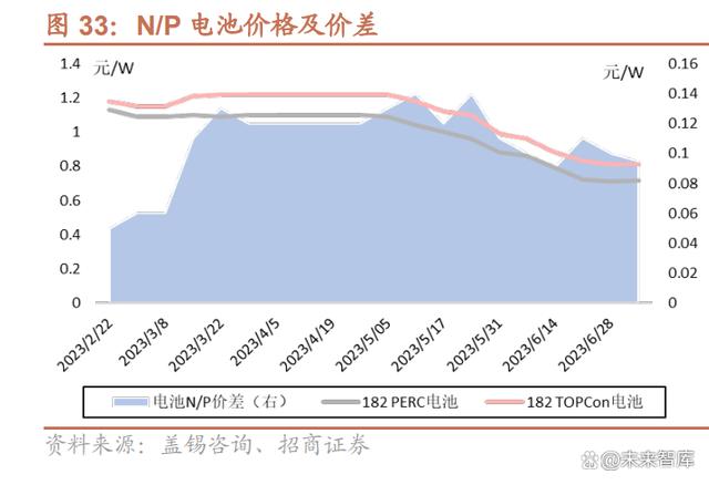 下游接受度躍升。經(jīng)歷 1 年多的市場驗證,下游投資方對 N 型優(yōu)勢理解更加深 刻。尤其是雙面率、衰減及溫度系數(shù)等優(yōu)勢帶來的發(fā)電量增益,隨實際應用的實 證數(shù)據(jù)逐步體現(xiàn),TOPCon 已得到行業(yè)性的認可。近期部分招標項目 N 型份額 已由此前 10%上下提升至近 50%。2021 年 PERC 市占率約 91%,2022 年降至 88%,而 N 型份額由 2021 年 3%提升至 9%,N 型電池進入規(guī)模化應用階段。 溢價不斷放大。近期 N 型組件與 P 型組件的價差,已由 2 月的 0.05 元/W 逐步 攀升至 0.06-0.14 元/W(近期組件報價偏分散),整體溢價逐步放大,原因主要 系隨 N 型產(chǎn)品進一步降本增效、電站有效驗證的形成,TOPCon 優(yōu)勢不斷驗證, 下游對 N 型組件的需求優(yōu)先級更高,高效組件的議價能力更強。如果效率繼續(xù)提 升,溢價有望進一步放大。而 TOPCon 電池供應相對緊張,相較 PERC 溢價由 0.06 元/W 上下爬升至 0.1 元/W。