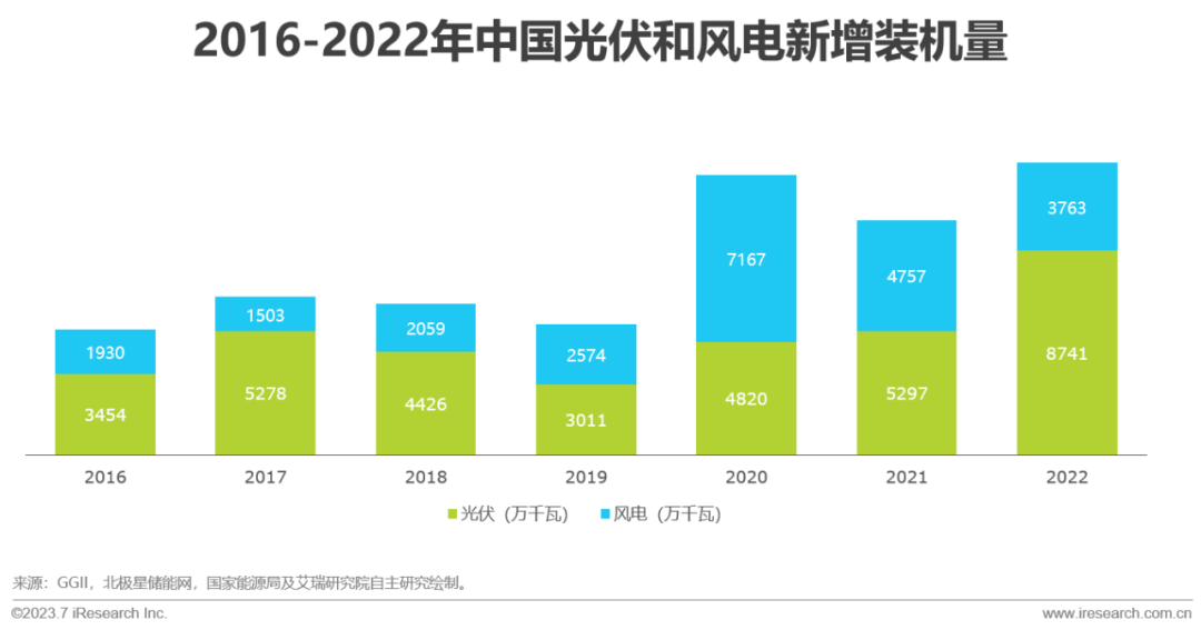 新型發(fā)電形式在電力市場裝機量中占比不斷增加,2022年我國風電、光伏發(fā)電量達到1.19萬億千瓦時,較2021年增加2073億千瓦時,同比增長21%,占全社會用電量的13.8%,同比提高2個百分點,接近全國城鄉(xiāng)居民生活用電量。同時電力基礎設備的老舊化已無法適應新型電力系統(tǒng)更綜合且龐大的電力結構。在風光發(fā)電模式的逐漸成熟化下,為提升整體電力系統(tǒng)可靠性,協調資源靈活使用、穩(wěn)定消納,市場開始逐步催生配儲需求。