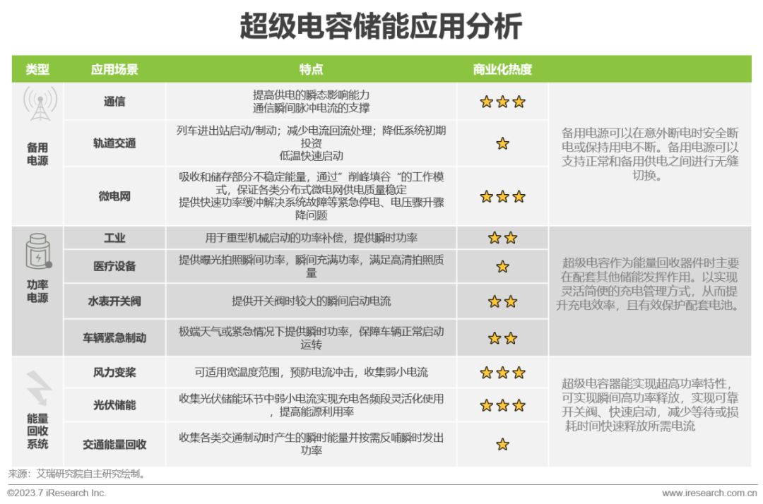 超級電容的電學特性決定了其直接做功的瞬時補償特征突出,并且功率損耗較低。在一些極端理想場景下,對于基于安全性考慮的響應效率和基于功率要求的超高功率特征,決定了其在重要的工業(yè)、基礎設施(通信、軌道交通等)均具備很理想的適用性。同時,如果能匹配其他的儲能方式,實現高功低釋的電能轉化,其場景應用將會更加靈活廣泛。