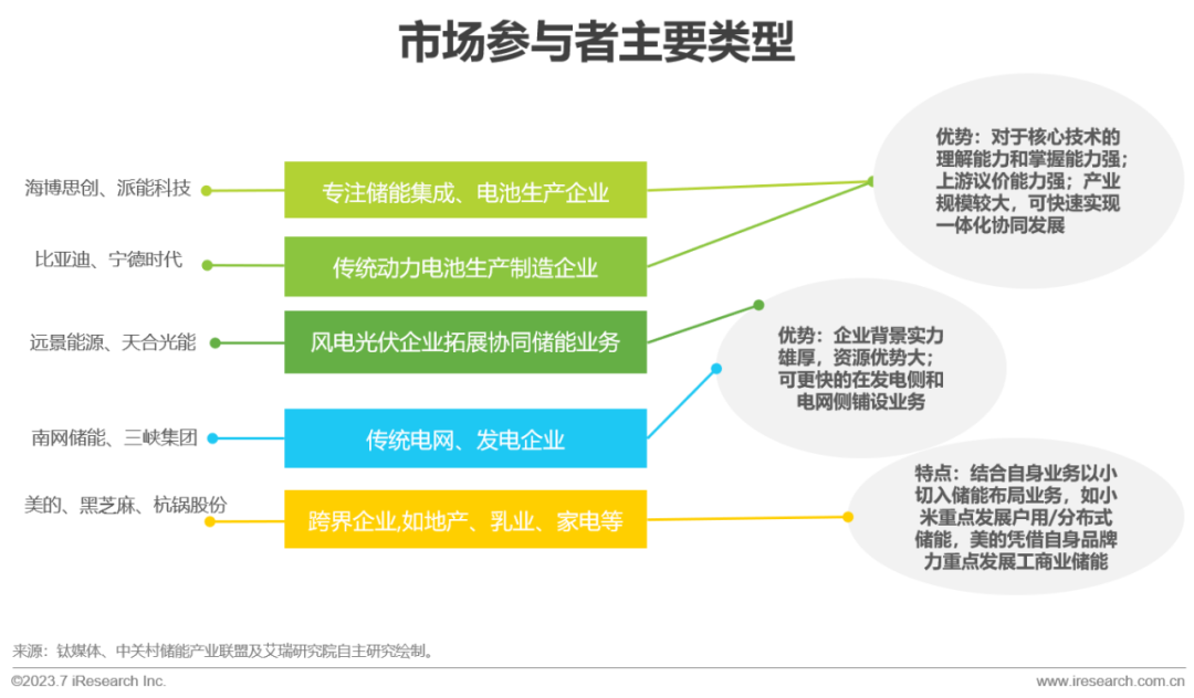 新能源的火熱帶動了儲能產業(yè)的快速發(fā)展,盡管儲能仍處于產業(yè)發(fā)展初期階段,商業(yè)模式和市場格局仍未定局。但市場已涌現各式參與者瓜分“蛋糕”。從動力電池廠商到食品互聯網企業(yè)跨界參與,市場玩家不斷涌入。市場參與者各有優(yōu)勢。針對儲能行業(yè)發(fā)展正處于供需端適配過程。