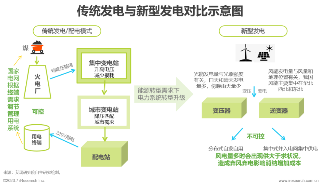 然而傳統(tǒng)發(fā)電主要為人工填料燃煤,可根據數據分析、節(jié)假日及不同季節(jié)負荷的特征、天氣預報等對未來幾日用電情況進行較為準確的預測,同步匹配用電系統(tǒng),并在運行過程中滾動調節(jié)運行。但同樣發(fā)電廠僅可實現發(fā)電不能儲電,仍需要調節(jié)電力供應以匹配需求端的電力變化,維持電力的供需平衡。相較傳統(tǒng)模式,新型電力系統(tǒng)雖有環(huán)保、能源儲量大等優(yōu)點,但由于來源主要為太陽能、風能等自然能源,受地理位置、天氣環(huán)境等影響,有資源波動不穩(wěn)定等天然缺陷,較難24小時控制以實現供需平衡。