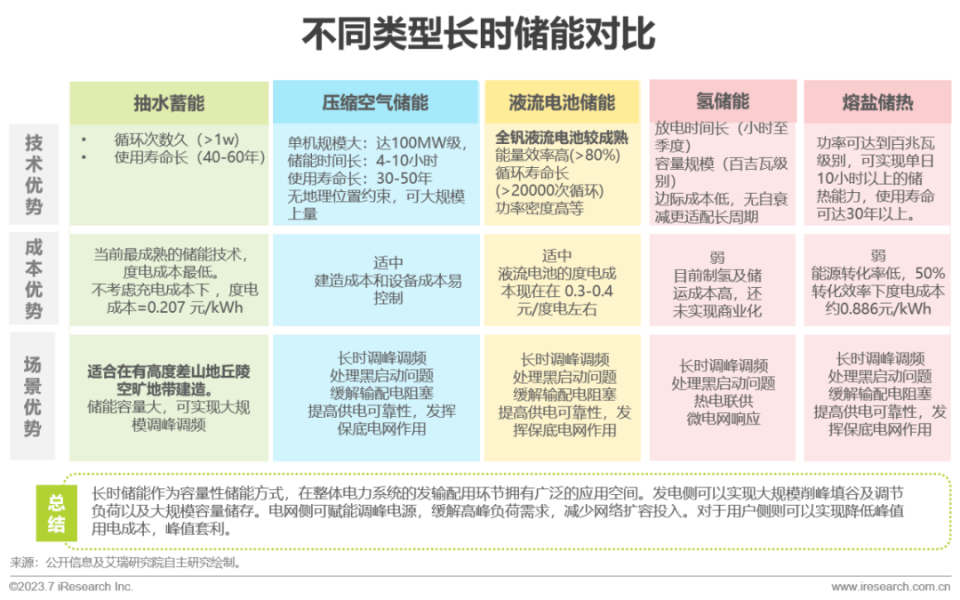 如果說短時儲能主要針對應急和小時級別調峰調頻需求。那么長時儲能會在可再生能源發(fā)電滲透率越高的場景下發(fā)揮更大發(fā)展?jié)摿?。風光電的占比越大,減少棄電、調頻調峰以及長時儲備的需求就越大。相較于短時儲能,長時儲能可以更好的實現電力平移,削峰填谷平衡電力系統(tǒng)、規(guī)?;瘍Υ骐娏捅U想娏Ψ€(wěn)定性。