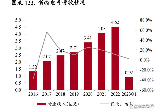 公司營業(yè)收入快速增長,干式變壓器貢獻(xiàn)主要收入。公司客戶包括新能源、高端裝備、高效節(jié)能、 工業(yè)企業(yè)電氣配套、基礎(chǔ)設(shè)施、民用住宅、傳統(tǒng)發(fā)電與供電、新型基礎(chǔ)設(shè)施等領(lǐng)域,其中新能源的 營收占比最高,是公司主要收入來源。受益于新能源領(lǐng)域的良好發(fā)展,公司營業(yè)收入從 2017 年的 20.11 億元增加到 2022 年的 47.46 億元,CAGR 達(dá) 18.73%,2023 年一季度實現(xiàn)營業(yè)收入 12.97 億元, 同比增長 41.06%,繼續(xù)保持增長態(tài)勢。分產(chǎn)品看,2017-2022 年干式變壓器系列收入占比 70%左右, 為公司主要的營收來源,儲能業(yè)務(wù)和數(shù)字化整體解決方案業(yè)務(wù)起步,給公司帶來新的收入增長點。