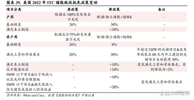 儲能稅收減免提升至以 30%為基礎(chǔ),經(jīng)濟(jì)性進(jìn)一步提升。 此前的 ITC 政策稅收抵免的基礎(chǔ)額度為 26%,現(xiàn)在在滿足工資和學(xué)徒要求后,基礎(chǔ)抵免可以達(dá)到 30%,另外,如果同時能夠滿足其他條件, 例如本土制作、位于能源社區(qū)等可進(jìn)一步提升抵免的額度,儲能電站的經(jīng)濟(jì)性得到進(jìn)一步提升。