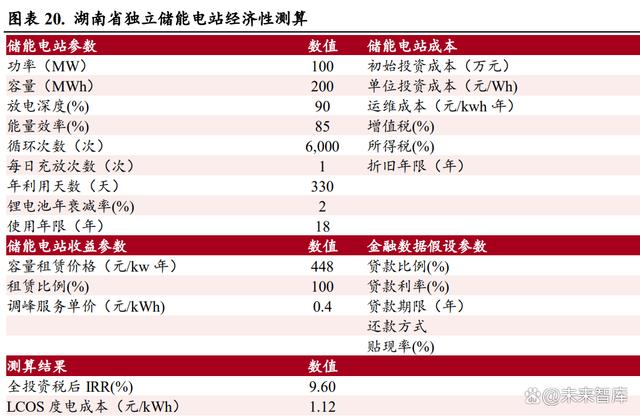 獨立儲能電站經(jīng)濟(jì)性可觀。我們以湖南省的實際情況為例,來測算獨立儲能電站的經(jīng)濟(jì)性,在目前 的各種條件下,湖南省獨立儲能電站的全投資稅后 IRR 達(dá)到 9.60%,具有客觀的收益性。 1)容量租賃收入假設(shè):參考湖南省的城步儒林 100MW/200MWh 儲能電站項目已經(jīng)簽訂的容量租賃 合同,湖南省的容量租賃價格為 448 元/kw*年。2)電力輔助服務(wù)收入假設(shè):電力輔助服務(wù)包括為電網(wǎng)公司提供調(diào)峰、調(diào)頻等服務(wù),按照每次調(diào)用規(guī) 模及調(diào)用次數(shù),電網(wǎng)公司給儲能電站支付費用。 參考湖南省的現(xiàn)行 政 策以及城步儒林 100MW/200MWh 儲能電站項目的運行情況,假設(shè)一年調(diào)用 330 天,每天一次充放,調(diào)用費用為每 次 400 元/MWh。