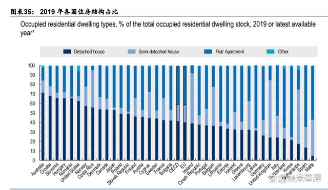 遠(yuǎn)期空間:美國房屋結(jié)構(gòu)具有天然優(yōu)勢,戶儲可利用屋頂面積高。戶用光伏和儲能設(shè)備通 常被安裝在家庭住房的屋頂上。因此,住房的類型、屋頂?shù)拿娣e大小等也直接決定了戶儲 的安裝難度和長期安裝需求,相對來說,獨立住房比高層樓房單戶房頂面積多,能夠安裝 更多戶儲,結(jié)構(gòu)也更適合當(dāng)前的分布式戶儲設(shè)備。根據(jù) OECD,美國 2019 年獨立住房和半 獨立住房的占比接近 70%,在統(tǒng)計的多個國家中排行第 6 名。根據(jù)美國經(jīng)濟分析局,2022 年美國人口 3.34 億,我們保守估計獨棟住房 6000 萬套,按 10%的滲透率、平均每戶 10kWh 計算,戶儲容量約為 600GWh,戶儲市場遠(yuǎn)期想象空間大。