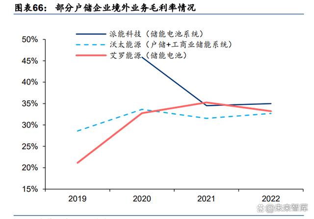 對比成熟的家電行業(yè):我們選取發(fā)展相對比較成熟的家電行業(yè)進行對比,家電企業(yè)做境外 業(yè)務(wù)主要有出口自有品牌、海外并購、ODM/OBM/OEM 代工三種模式。我們通過對比發(fā)現(xiàn), 選擇自有品牌模式的樂歌股份、安克創(chuàng)新、石頭科技、星徽股份能夠在境外獲得更高的毛 利率,我們計算四家企業(yè) 2018-2022 年境外與境內(nèi)的毛利率差值均值為 10.65pct。同時, 由于能夠選擇以自有品牌打海外市場的公司產(chǎn)品具有較強的產(chǎn)品力,其整體毛利率通常也 處于較高水平。戶儲產(chǎn)品在一定程度上具有家電屬性,國內(nèi)儲能產(chǎn)業(yè)鏈發(fā)展國際領(lǐng)先,具 有強產(chǎn)品力與品牌力,隨著后續(xù)行業(yè)競爭加劇,我們認(rèn)為穩(wěn)態(tài)下戶儲行業(yè)優(yōu)質(zhì)企業(yè)仍能夠 維持高出國內(nèi)市場平均 5 個百分點以上的毛利率水平。