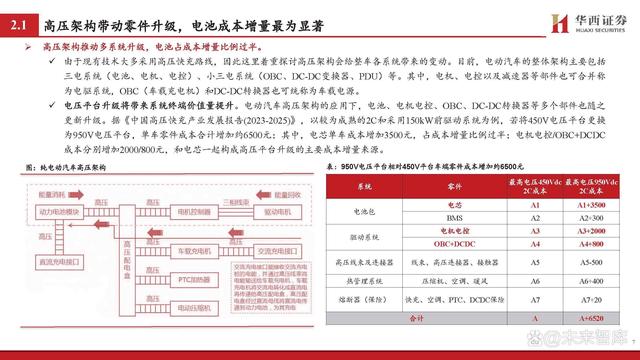 高壓架構推動多系統(tǒng)升級,電池占成本增量比例過半。 由于現有技術大多采用高壓快充路線,因此這里著重探討高壓架構會給整車各系統(tǒng)帶來的變動。目前,電動汽車的整體架構主要包括 三電系統(tǒng)(電池、電機、電控)、小三電系統(tǒng)(OBC、DC-DC變換器、PDU)等。其中,電機、電控以及減速器等部件也可合并稱 為電驅系統(tǒng),OBC(車載充電機)和DC-DC轉換器也可統(tǒng)稱為車載電源。 電壓平臺升級將帶來系統(tǒng)終端價值量提升。電動汽車高壓架構的應用下,電池、電機電控、OBC、DC-DC轉換器等多個部件也隨之 更新升級。據《中國高壓快充產業(yè)發(fā)展報告(2023-2025)》,以較為成熟的2C和采用150kW前驅動系統(tǒng)為例,若將450V電壓平臺更換 為950V電壓平臺,單車零件成本合計增加約6500元;其中,電芯單車成本增加3500元,占成本增量比例過半;電機電控/OBC+DCDC 成本分別增加2000/800元,和電芯一起構成高壓平臺升級的主要成本增量來源。