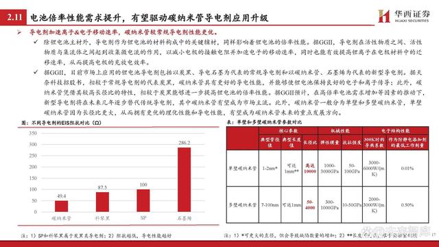 導電劑加速離子&電子移動速率,碳納米管較常規(guī)導電劑性能更優(yōu)。除鋰電池主材外,導電劑作為鋰電池的材料構成中的關鍵輔材,同樣影響著鋰電池的倍率性能。據GGII,導電劑在活性物質之間、活性 物質與集流體之間起到收集微電流的作用,以減小電極的接觸電阻并加速電子的移動速率,同時也能有效提高鋰離子在電極材料中的遷 移速率,從而提高電極的充放電效率。 據GGII,目前市場上應用的鋰電池導電劑包括以炭黑、導電石墨為代表的常規(guī)導電劑和以碳納米管、石墨烯為代表的新型導電劑。據天 奈科技招股書,相較于常規(guī)導電劑的代表炭黑,碳納米管具有更好的導電性能,并能夠使鋰電池保持良好的電子和離子傳導;此外,碳 納米管憑借其較高長徑比的特性,相較于炭黑能夠進一步提高鋰電池的倍率性能。據GGII預計,在高倍率電池需求增加等因素的推動下, 新型導電劑將在未來幾年逐步替代傳統(tǒng)導電劑,其中碳納米管有望成為市場主流。此外,碳納米管一般分為單壁和多壁碳納米管,單壁 碳納米管因為長徑比更大,從而擁有更優(yōu)的理化性能和導電性能,有望成為碳納米管未來的重點發(fā)展方向。