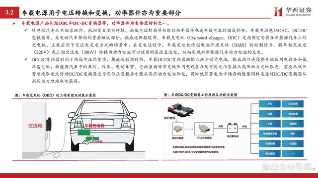 車載電源產品包括OBC和DC-DC變換器等,功率器件為重要原材料之一。 除電動汽車的電驅系統(tǒng)外,承擔交直流電轉換、高低電壓轉換等功能的功率器件也是車載電源的組成部分。車載電源包括OBC、DC-DC 變換器等,是電動汽車架構的重要組成部分。據威邁斯招股書,車載充電機(On-board charger,OBC)是指固定安裝在新能源汽車上的 充電機,主要應用于交流電充電方式的場景中。在充電過程中,車載充電機依據電池管理系統(tǒng)(BMS)的控制信號,將單相交流電 (220V)或三相交流電(380V)轉換為動力電池可以使用的高壓直流電,從而實現對新能源汽車動力電池的充電。 DC/DC變換器則用于高低電壓的變換。據威邁斯招股書,車載DC/DC變換器的輸入端為動力電池,輸出端口連接整車低壓用電設備和低 壓蓄電池。新能源汽車中的車燈、儀表、電動車窗、電動座椅等常見低壓用電設備在運行時無法直接從高壓動力電池取電,需要從低壓 蓄電池取電或借助DC/DC變換器進行高低壓變換后才能從高壓動力電池取電,同時低壓蓄電池中儲存的能量同樣是通過DC/DC變換器從 高壓動力電池取電獲得。