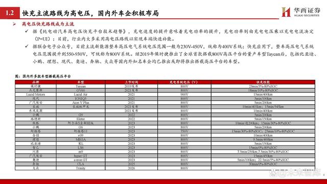 高電壓快充路線成為主流 。據《純電動汽車高電壓快充平臺技術趨勢》,充電速度的提升意味著充電功率的提升,充電功率則由充電電壓乘以充電電流決定 (P=UI);目前,行業(yè)內大多采用高電壓路線以實現車端快速補能。 據聯(lián)合電子公眾號,目前主流新能源整車高壓電氣系統(tǒng)電壓范圍一般為230V-450V,統(tǒng)稱為400V系統(tǒng);快充應用下,整車高壓電氣系統(tǒng) 電壓范圍提升到550-930V,可統(tǒng)稱為800V系統(tǒng)。繼2019年保時捷推出了全球首款搭載800V高壓平臺的量產車型Taycan后,包括比亞迪、 小鵬、理想、現代、奧迪、奔馳、大眾等國內外知名車企均已推出或即將推出搭載高壓平臺的車型。