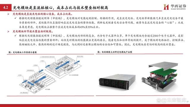 充電模塊是直流充電樁的核心設備,成本占比高。 根據優(yōu)優(yōu)綠能招股說明書(申報稿),充電模塊對電能起到控制、轉換的作用,是直流充電樁、充電柜等新能源汽車直流充電設備中最 為重要的部件,其性能不僅直接影響直流充電設備的整體性能,同樣也關聯(lián)著充電安全等問題,被譽為直流充電設備的“心臟”;從成 本角度考慮,充電模塊占據整個直流充電樁成本的45%至55%左右。