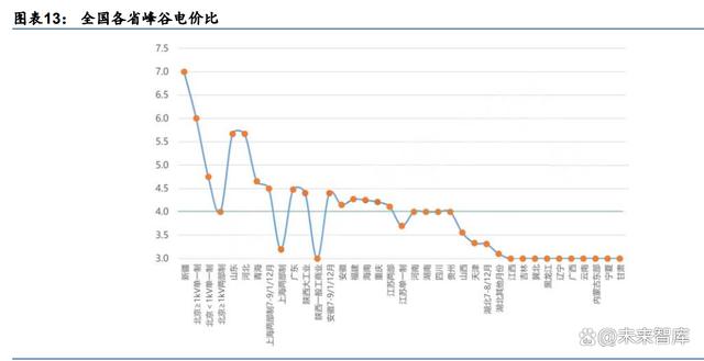國家發(fā)改委推動(dòng)合理拉大峰谷電價(jià)差,引導(dǎo)電力用戶削峰填谷。2021 年 7 月,國家發(fā)改委 印發(fā)《關(guān)于進(jìn)一步完善分時(shí)電價(jià)機(jī)制的通知》,部署各地進(jìn)一步完善分時(shí)電價(jià)機(jī)制,合理拉 大峰谷電價(jià)價(jià)差,為引導(dǎo)電力用戶削峰填谷、促進(jìn)儲(chǔ)能加快發(fā)展釋放了清晰強(qiáng)烈的價(jià)格信 號(hào):(1)優(yōu)化峰谷電價(jià)機(jī)制:積極優(yōu)化峰谷電價(jià)機(jī)制,科學(xué)劃分峰谷時(shí)段,合理確定峰谷 電價(jià)價(jià)差,系統(tǒng)峰谷差率超過 40%的地方,峰谷電價(jià)價(jià)差原則上不低于 4:1;其他地方原 則上不低于 3:1。(2)建立尖峰電價(jià)機(jī)制:在峰谷電價(jià)的基礎(chǔ)上推行尖峰電價(jià)機(jī)制,主要基 于系統(tǒng)最高負(fù)荷情況合理確定尖峰時(shí)段,尖峰電價(jià)在峰段電價(jià)基礎(chǔ)上上浮比例原則上不低 于 20%??蓞⒄占夥咫妰r(jià)機(jī)制建立深谷電價(jià)機(jī)制。隨后,各省市分時(shí)電價(jià)政策步入快速完 善期,出臺(tái)相關(guān)政策調(diào)整峰谷時(shí)段劃分和電價(jià)浮動(dòng)比例。