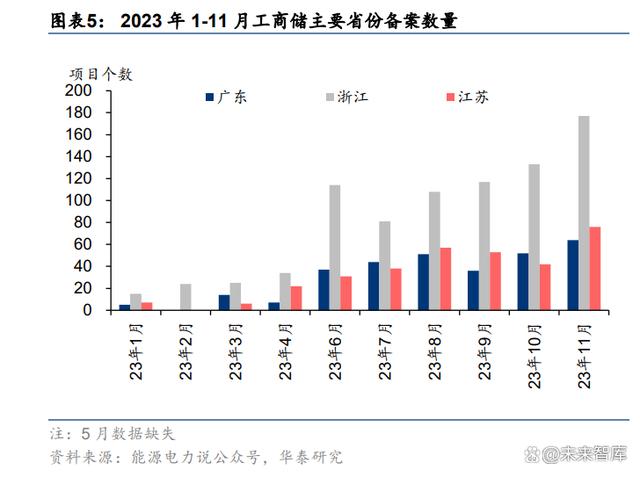 多因素推動(dòng),23 年高增趨勢(shì)初現(xiàn)。根據(jù)能源電力說公眾號(hào)的不完全統(tǒng)計(jì),僅 2023 年 7-11 月,國內(nèi)工商業(yè)儲(chǔ)能備案項(xiàng)目個(gè)數(shù)達(dá) 1305 個(gè)。從工商業(yè)分布較為集中的廣東、浙江、江蘇 三個(gè)省份來看,月度備案項(xiàng)目數(shù)量均呈現(xiàn)大幅上升趨勢(shì)。據(jù)不完全統(tǒng)計(jì),2023 年以來我國 工商業(yè)儲(chǔ)能備案規(guī)模已經(jīng)達(dá)到 3.46GW/9.26GWh。工商業(yè)儲(chǔ)能高速增長的勢(shì)頭已經(jīng)初步顯 現(xiàn),2023 年成為國內(nèi)工商儲(chǔ)的放量元年。