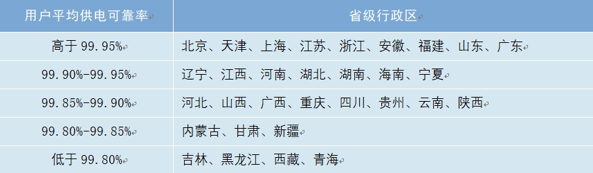 2023年,全國(guó)31個(gè)省級(jí)行政區(qū)中,北京、上海、廣東、天津、江蘇、浙江、安徽、福建、山東的用戶平均供電可靠率高于99.95%,內(nèi)蒙古、吉林、黑龍江、西藏、甘肅、青海、新疆的用戶平均供電可靠率低于99.85%。